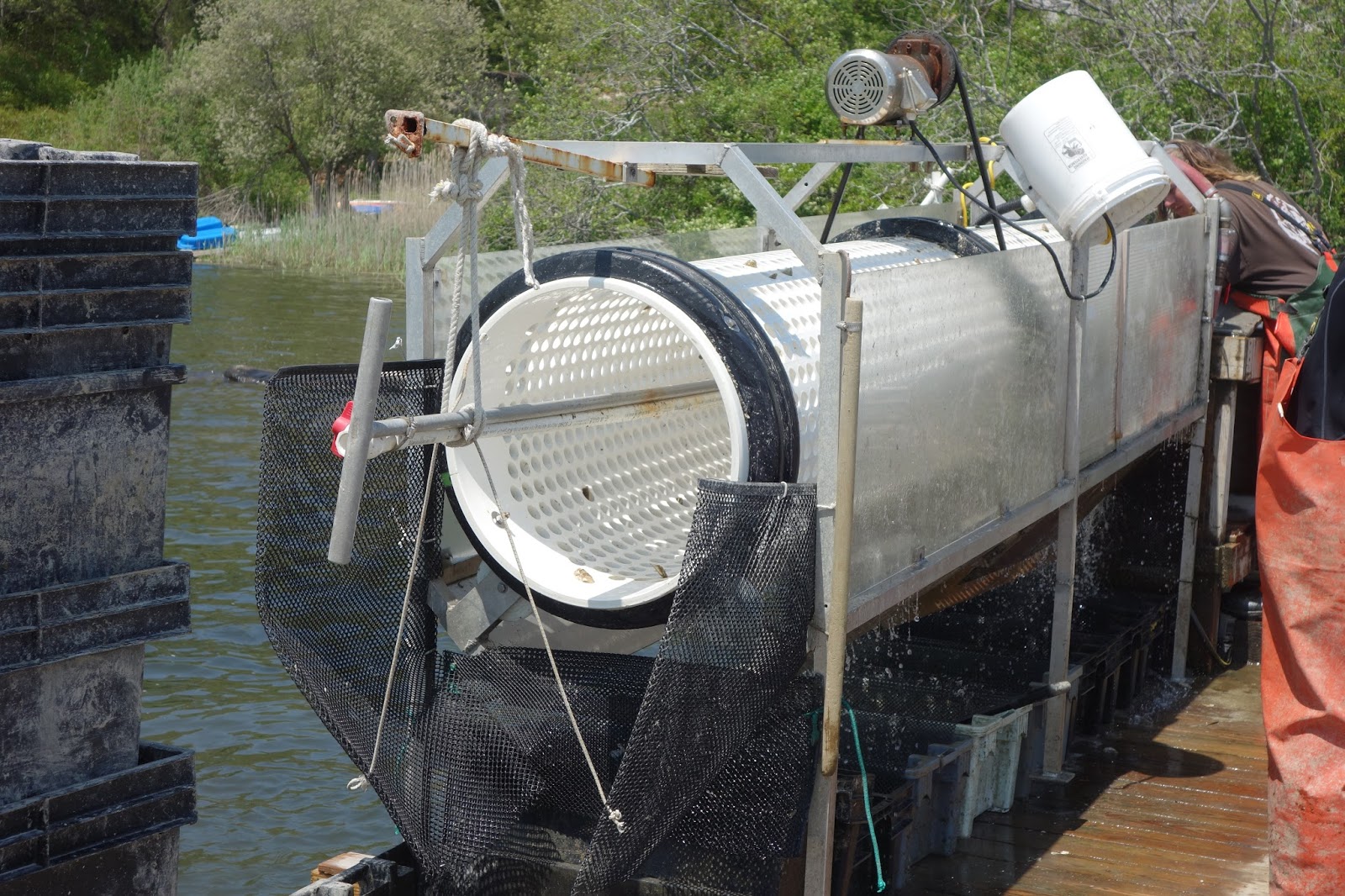This machine sorts the oysters by size, kind of like how a coin machine operates to separate dimes from nickels and quarters.