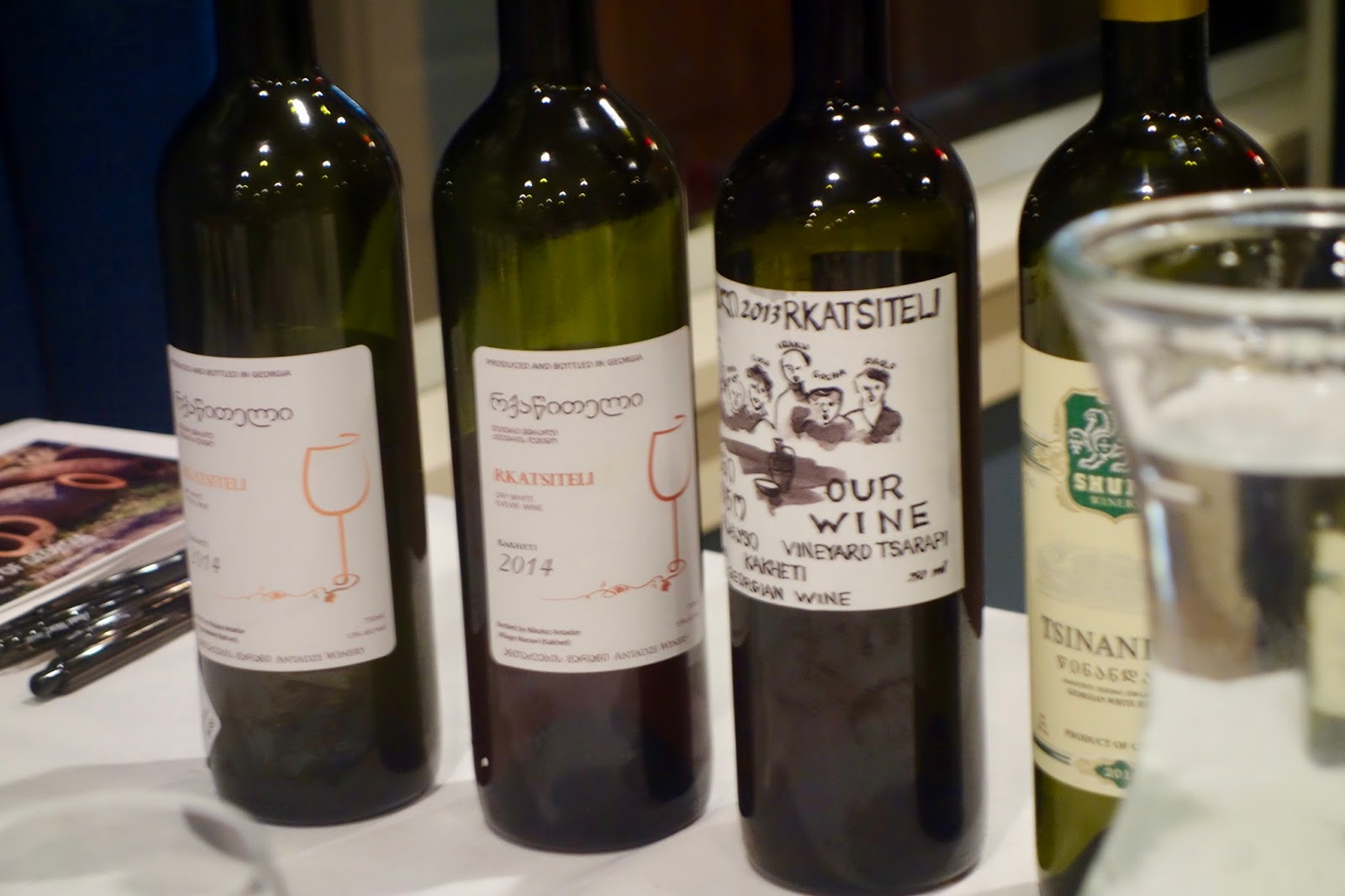 The first flight of four wines were all made from the Rkatsiteli grape, an ancient, indigenous white grape, whose name means "red stem," and which is known for its high acidity. It does well with different vinification methods, is generally neutral in flavor and can be reiminscent of Ribolla Gialla. Some Rkatiseli is actually grown in the U.S., including in Massachusetts and New York.
