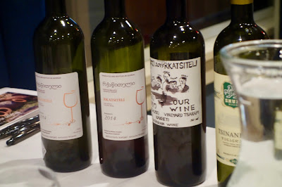 As an aperitif, before the event got started, we tasted the 2013 Lagvinari Tsolikouri, made from the indigenous Tsolikouri grape and which is primarily found in the Imereti region. Lagvinari is a small, organic winery and this wine was fermented in qvevri, wasn't fined or filtered, and is even vegan/vegetarian. With a 11.5% ABV, this is a dry, orange wine with intriguing flavors of bright citrus and apple, with hints of herbs, dried fruit, nuts, and some minerality. Delicious and complex, this was a fine way to begin the tasting event.