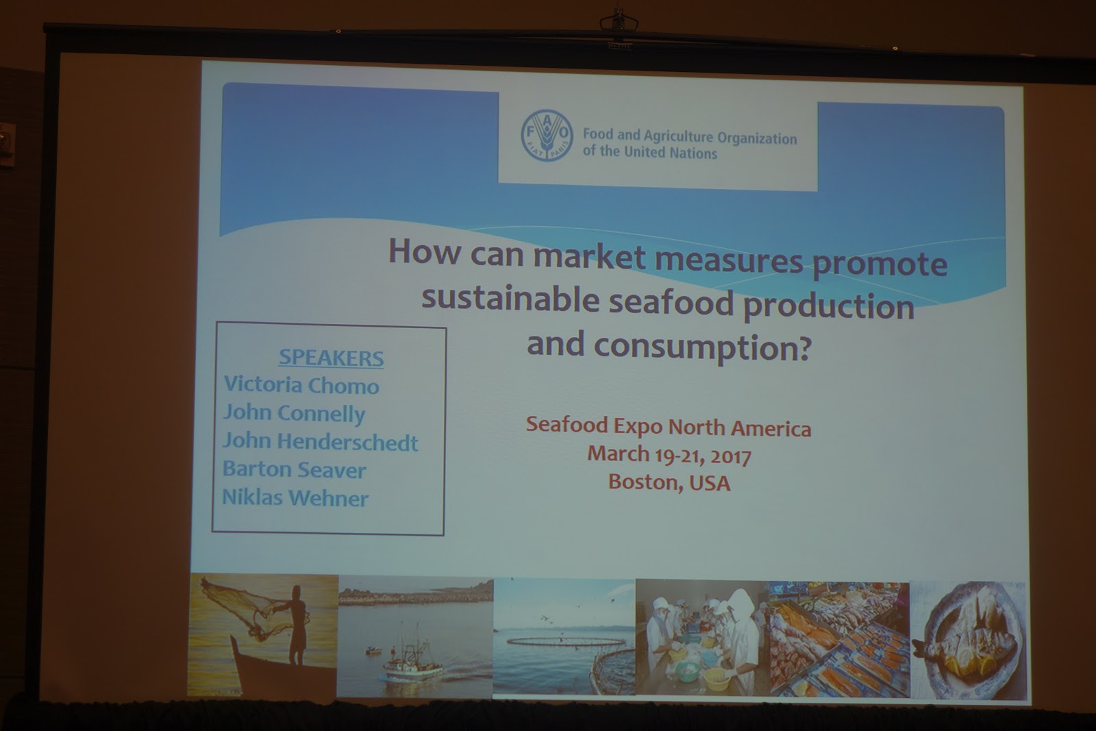 The first conference session I attended at SENA was "How Can Market Measures Promote Sustainable Seafood Production and Consumption" which was intended to discuss the following: "What is the current situation, where are we headed, and how can we insure that sustainable practices are adopted to meet future demand? First, a statistical overview of global trends (FAO stats) in seafood production, consumption and trade, along with a comparison of model projections (FAO/OECD/WB) of future production and utilization. Second, identification of key factors that hinder sustainable production, consumption and trade of fish products that threaten our future seafood supplies, global food security, and achievement of the UN Sustainable Development Goals."