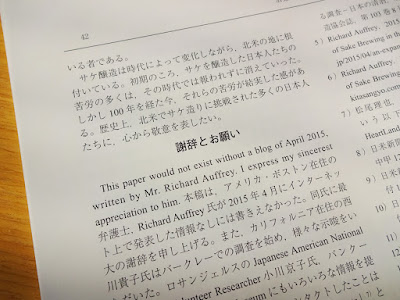 Recently, Mr. Kita was published an article, Sake Brewing History in North America‒ Complete List of Sake Breweries existed/existing in the US and Canada, in the The Japanese Journal For The History of Brewing (#32, February 2017). In the above photo, you can see the front cover of the journal, which is in Japanese. At the top of this page, you can see the English version of the journal's cover. The article, written in Japanese, is 27 pages long, and includes a few charts and photographs, building upon much of the history from my article. It is well worth seeking out this article if you can read Japanese.