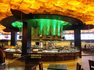 The buffet room is quite stunning, with a brightly colored ceiling, wolf head sculptures, and multi-shaded colored tiled columns. It is still a casual restaurant, but visually very appealing which adds a little elegance to the destination. The 250-linear-foot serving line can display over 200 different items. The buffet is open seven days a week, for breakfast ($11.75), lunch ($19.75) and dinner ($23.50). I believe these are reasonable prices for the amount of food available at the buffet, and the prices are certainly less than many other similar buffets.