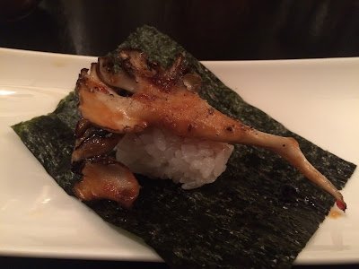 We moved onto our first Sushi dish, Kama Toro, which is part of the tuna around its collarbone. The Kama is high in fat, making it very tender, and its flavor is more concentrated that most other parts of the tuna. As this is a rare cut, it was a special treat. This Kama was marinated yakiniku, grilled over bincho tan, with nikiri-soy (a sweet soy sauce). This sushi was lightly warm, melted in my mouth like creamy butter and there was a light sweetness to the intense taste of the tuna. Simply superb. This was far above the usual tuna you have at sushi restaurants.
