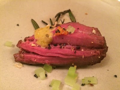 The presentation for this dish, Seared Hangar Steak, was cool as the glass held in the aromatic smoke. The steak was accompanied by black lava salt, burnt rosemary scent, AA choy (a Chinese vegetable also known as Taiwan lettuce), and blood orange kosho (a salted cured condiment). This was a Steak Nigiri, sitting atop vinegared rice. The beef had a smoky edge to it, with a strong flavor of rosemary, and nice acidity from the kosho. The beef was tender, with a nice texture, and it made for an interesting diversity after several dishes of seafood.