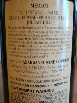 I recently discussed the wines of Israel and then found one of their wines at the Grapevine Travelers in Medford. I bought the 2002 Noah Tevel Merlot ($23) which is imported by Abarbanel Wine Co.