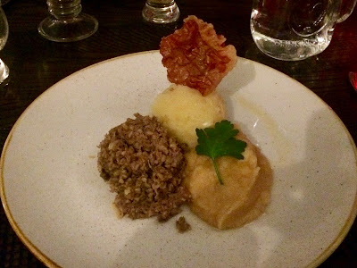 At a Robert Burns Scotch Dinner, they served Haggis, a traditional Scottish dish that's made from a sheep's heart, liver and lungs, mixed with onion, oatmeal, suet, spices, and salt, and then encased in a sheep's stomach. Authentic Scottish haggis though can't be imported into the U.S. so the restaurant sourced it from a place in New Jersey, which was made with oatmeal, beef liver, lamb breast, onions and spices. Though a bit leery, the haggis had a pleasant aroma and when I bit into it, it was actually delicious. A silky texture like corned beef hash with a nice balance of spices and a slightly earthy element. I devoured every bit of haggis on my plate and would order it again if I had the opportunity.